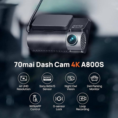 دوربین 70maI Dash Cam 4K + GPS A800S از سری دوربین های نسل جدید می باشد که دارای سنسور IMX415 ساخت شرکت بزرگ سونی است که می تواند با رزولوشن 3840×2160 به صورت 4k و دیافراگم F1.8 فیلم‌برداری کند. این دوربین می‌تواند جزییات بالایی که شما در جاده می‌بینید را ثبت کند نمایشگر این دوربین نیز 3 اینچی می باشد . کیفیت ثبت شده توسط آن برابر است با 4K Ultra HD است که خود گواه دقت بسیار بالا و شفافیت تصویر و وضوح خوب آن است. گفتنی است که 7 لایه لنز برای این دوربین در نظر گرفته شده است که همگی بر نتیجه دریافتی تأثیر مثبتی خواهند گذاشت. زاویه‌ای که دوربین مناظر روبه‌روی خود را ثبت خواهد کرد، برابر با 140 درجه است.ابعاد این سنسور نیز از قرار 88×59.8×36.3 میلی‌متر است. یکی از مهم‌ترین قابلیت های این دوربین قابلیت دید در شب است. به واسطه این قابلیت دوربین می‌تواند در شرایطی که نور کمی وجود دارد نیز فیلم‌برداری کند. البته امروزه که تقریبا همه دوربین ها قابلیت نایت ویژن دارند، این کیفیت تصاویر ثبت شده در شب است که حائز اهیمت است. تکنولوژی 3D DNR که مخفف Digital Noise Reduction است در افزایش کیفیت تصاویر ثبت شده تاثیر بالایی دارد، همچنین باید اضافه کرد که الگوریتمی با هوش مصنوعی (AI) در این دوربین به کار رفته است که به کمک آن و در مجموع، قابلیت‌هایی که عنوان شد؛ نویزهای دیجیتالی که بر اثر نور کم تشکیل می‌شوند حذف خواهند شد و تصاویر روشن و شفاف می‌شوند. سیستم ADAS یا Advanced Driver-Assistance System که تکنولوژی دستیار خودرو می باشد جهت بهبود وضعیت رانندگی به دوربین نسل جدید مدل A800s و A500s اضافه شده است. وظیفه اصلی این دستیار هوشمند پیش‌بینی تصادفات احتمالی و صدور فرمان‌هایی برای جلوگیری از آن‌هاست. به طور مثال زمانی که دارید از لاین خودتان سبقت می‌گیرید یا فاصله کمی با ماشین جلویی دارید این دستیار هوشمند به شما اخطار می‌دهد تا ایمنی خود را حفظ کنید. با استفاده از نرم افزار دستگاه که به راحتی هر دو سیستم عامل Android و iOS را پشتیبانی می‌کند می توان ویدیوهای دوربین خود را از طریق WiFi دانلود و تماشا کنید. همچنین با قابلیت‌هایی که برای اپلیکیشن قرار داده شده است، شما می‌توانید اطلاعاتی که هنگام مسیر بدست آورده‌اید را با دوستان خود به اشتراک بگذارید .