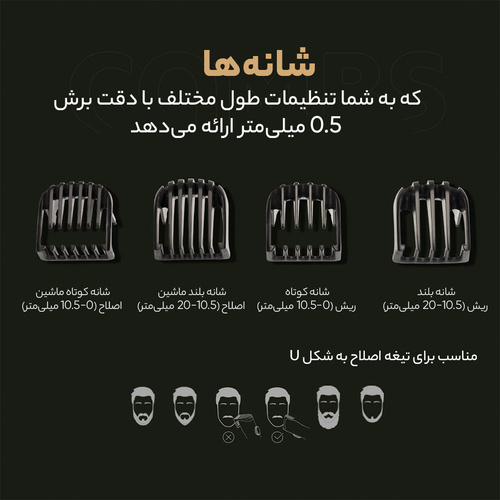 سایز شانههاتعداد تنظیمات طول : 40 دقت پیرایش ک 0.5 میلی متر محدوده تنظیمات طول : 0.5 تا 10 میلی متر