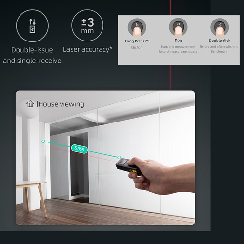 متر لیزری هوشمند شیاومی تنها یک دکمه کنترل دارد که با فشار دادن به مدت 2 ثانیه روشن می‌شود. با فشار کوتاه، اندازه گیری شروع می‌شود، در حالی که دوبار کلیک روی دکمه معیارهای جلو و عقب را تغییر می‌دهد. طراحی تک دکمه‌ای کار با دستگاه را آسان می‌سازد. بدنه این دستگاه از آلیاژ آلومینیوم سبک وزن و پلاستیک‌های مهندسی با استحکام بالا ساخته شده است که نه تنها ظاهری مات دارند بلکه در برابر سایش و خش مقاوم‌تر هستند. پس از یک فشار کوتاه برای راه‌اندازی، این متر می‌تواند طول فعلی را در لحظه نمایش دهد. این دستگاه از یک لیزر دقیق و پایدار کلاس II استفاده می‌کند که می‌تواند فواصلی به نزدیکی 5 سانتی‌متر و به دوری 40 متر را اندازه بگیرد. مراحل پیچیده مجموعه داده‌های و انتشار لیزر در یک لحظه به پایان می‌رسد و دقت داده‌ها می‌تواند به ±3 میلیمتر برسد که دقیق و قابل اعتماد است.به علاوه، این دستگاه از عملکردهای متعددی مانند اتصال به گوشی‌های همراه و پیوند با برنامه شیاومی برای تحقق بخشیدن به همگام سازی داده‌ها، محاسبه طول/مساحت/حجم، نقشه برداری و طبقه بندی، به اشتراک گذاری رسم و مشاهده جلوه‌ها پشتیبانی می‌کند.